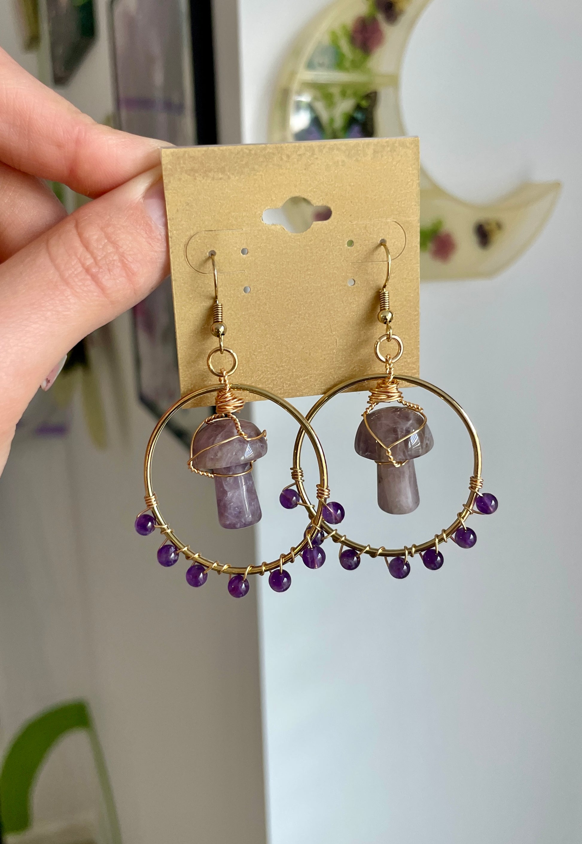 These crystal mushroom earrings have been intuitively wrapped and decorated with gold colored wire. Each comes on 18k gold plated ear wires. Please reach out if you need another material type for your ear wires.