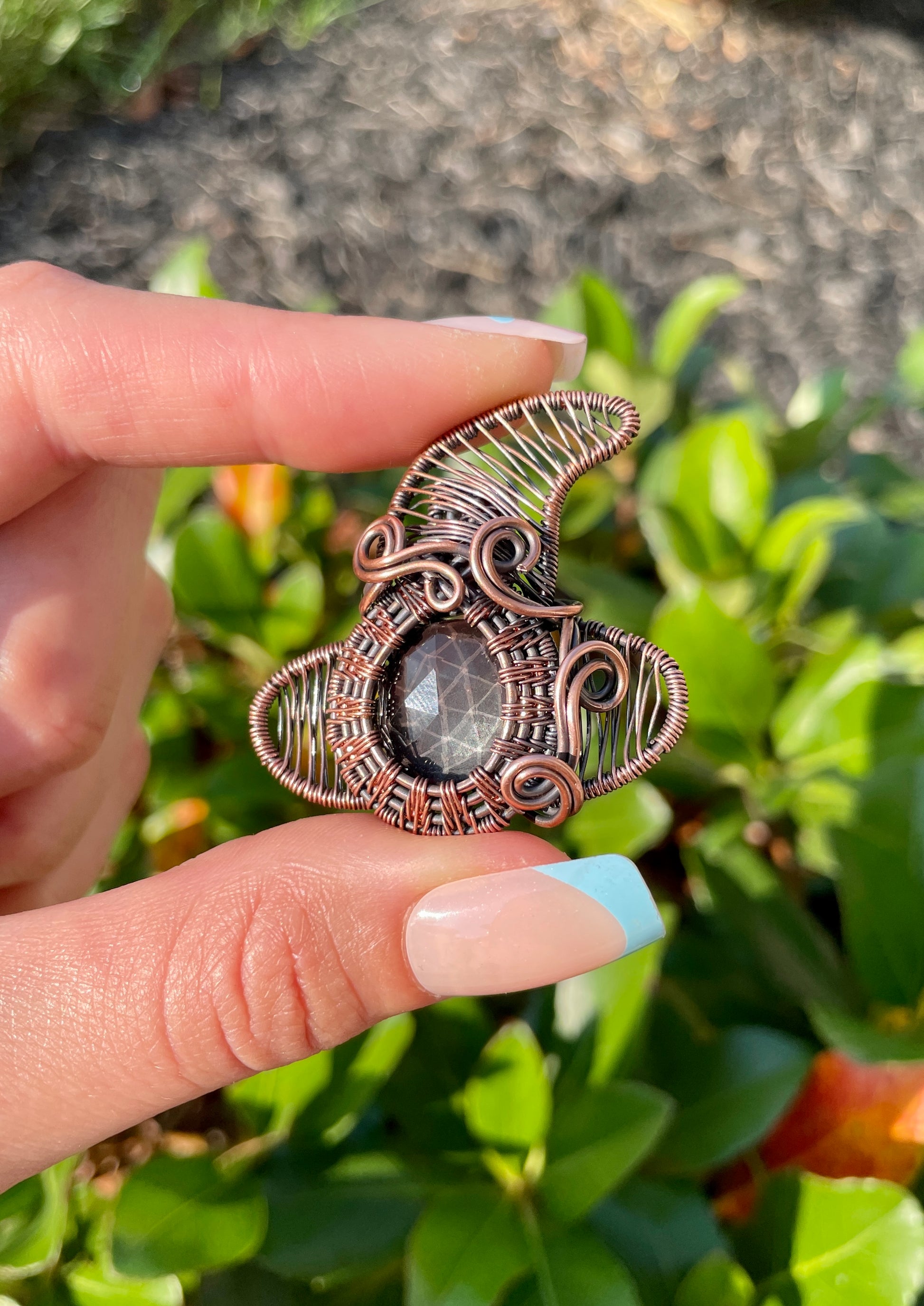This silver sheen obsidian doublet witch’s hat has been intuitively wrapped and decorated with pure copper wire and oxidized to give an antique finish. It comes on a matching 18" antique copper chain necklace.