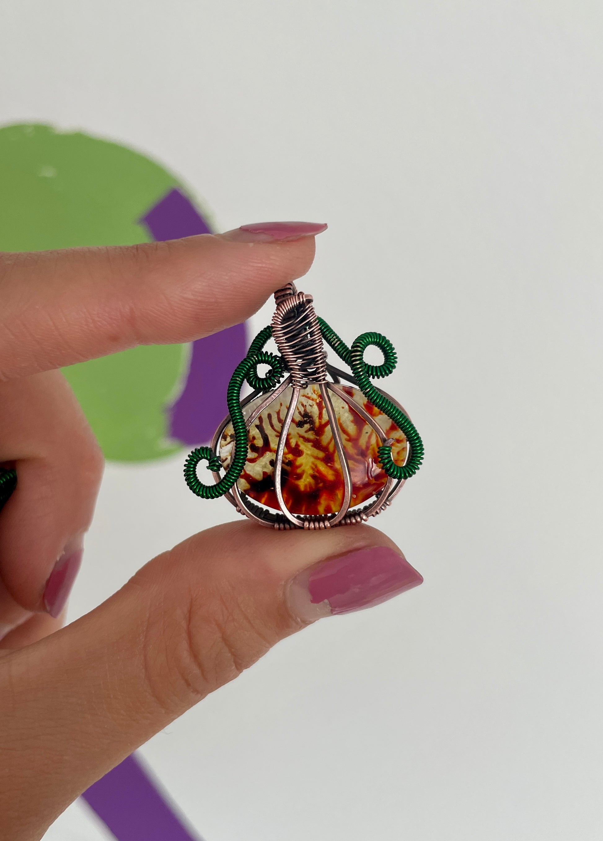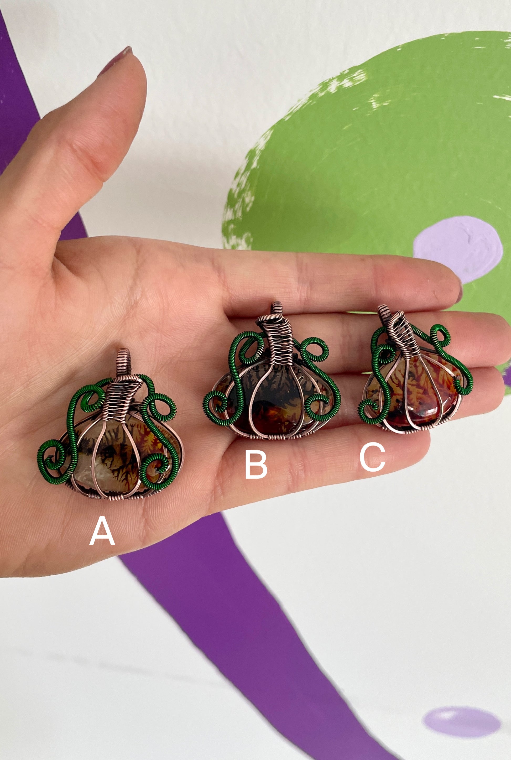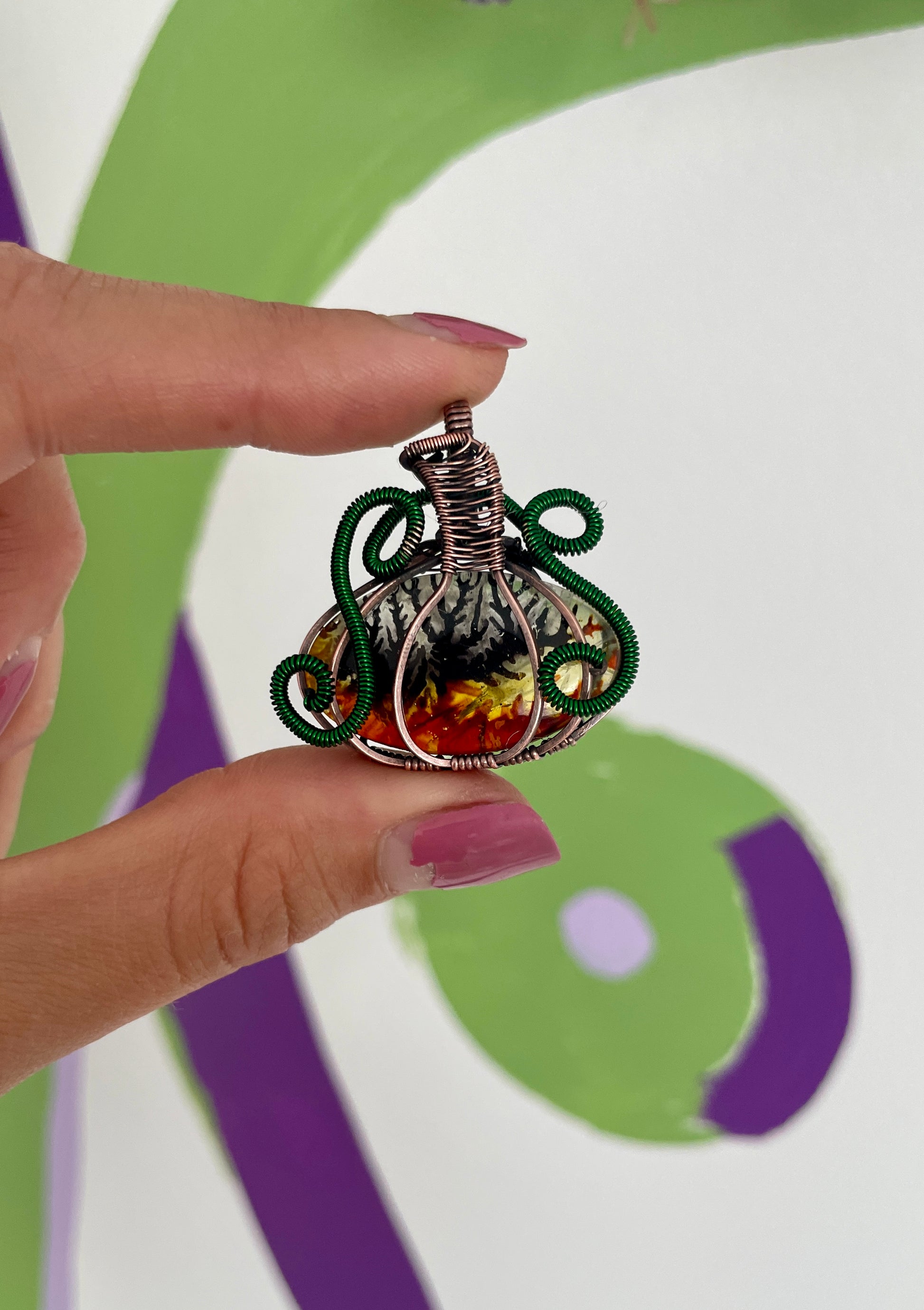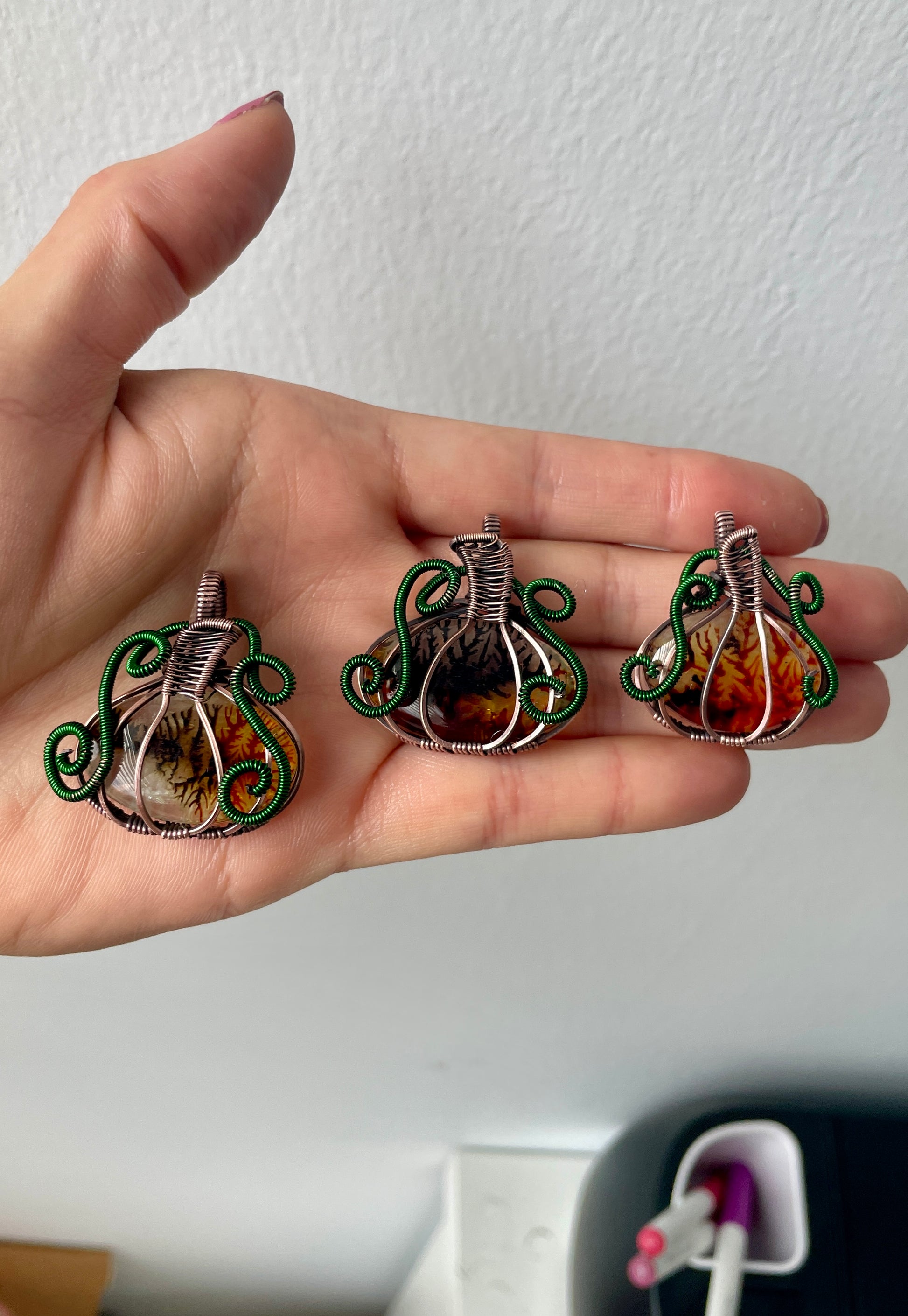 Dive into the whimsical world of our Dendritic Agate Pumpkin Necklace, a perfect fusion of natural spooky vibes and artistic craftsmanship. This necklace features an intuitively selected dendritic agate, known for its grounding and peaceful properties, intricately wrapped in pure copper wire with striking silver-plated bright green accents.